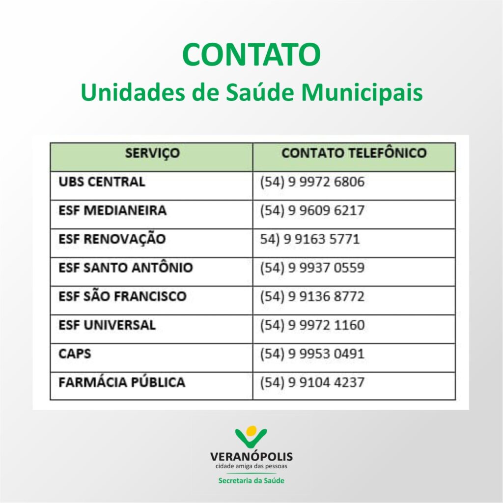 Confira o contato telefônico, excepcionalmente com os serviços de saúde municipais.