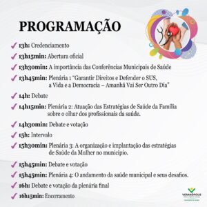 Com o tema “Garantir Direitos e Defender o SUS, a Vida e a Democracia – Amanhã Vai Ser Outro Dia”, a Prefeitura de Veranópolis, por meio da Secretaria da Saúde e do Conselho Municipal de Saúde, estão promovendo no dia 29 de março, das 13h às 17h, na Casa da Cultura, a Conferência Municipal da Saúde.