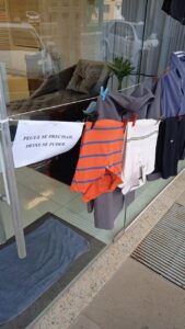 A loja Decorsul Ambientes está realizando um varal comunitário. A ação consiste em deixar penduradas em um varal peças de vestuário e cortinas para que as pessoas que necessitarem possam pegar conforme necessitam. Além disso, quem quiser colaborar, doando peças, podem pendurar os itens no local.