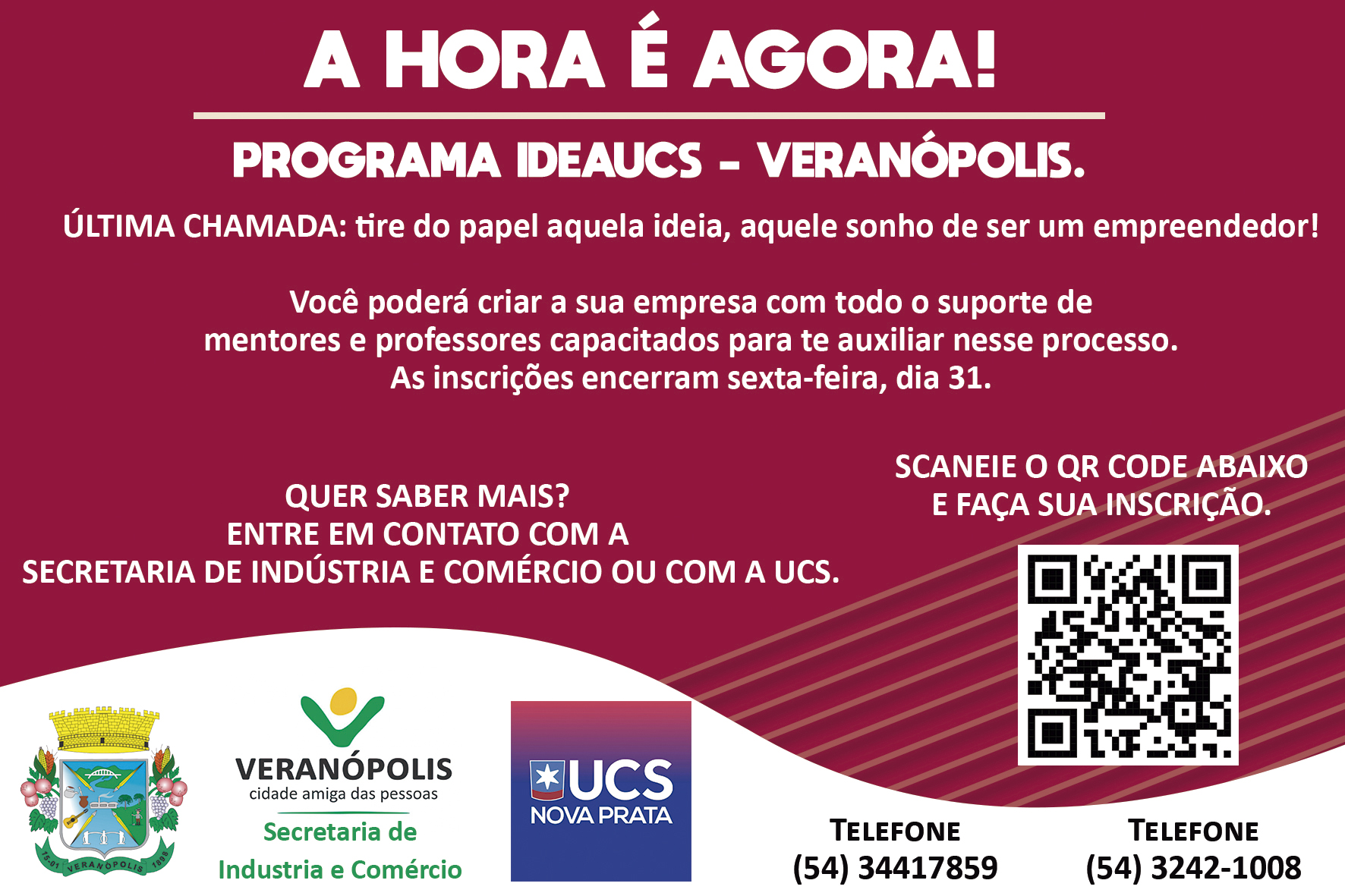 O Programa IdeaUCS, tem como objetivo transformar ideias inovadoras em startups, buscando viabilizar o crescimento e fortalecimento de empreendedores e iniciativas inovadoras, que possam gerar inovações para o município. As inscrições de ideias inovadoras e mentores, podem ser feitas até o dia 31 de março.