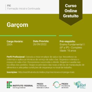 As inscrições serão aceitas até às 23 horas e 59 minutos do dia 14 de agosto de 2022 e deverão ser realizadas pelo preenchimento dos formulários disponibilizados em http://ead.ifsul.edu.br/index.php/inscricoes-emprega-mais?fbclid=IwAR31M2E6tUMu4GnWT13I9wrAmwfhs0URgjmuTySbvQ2b7GtwpFOWc-vks-g