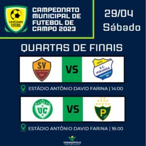 Quartas de finais do Campeonato Municipal de Futebol Campo 2023 Esporte By Redação 2 On 27 abr, 2023 Compartilhar Neste sábado, dia 29 de abril, acontecem mais dois jogos das quartas de finais do Campeonato Municipal de Futebol de Campo 2023. Notícias relacionadas Esportivo perde para o Inter-SM e demite o… 3 jun, 2025 Escolinha de Vôlei CTBBT participa da 2ª etapa do… 2 jun, 2025 Torneio de Vôlei de Areia reúne mais de 50 atletas… 2 jun, 2025 Os confrontos serão a partir das 14h, no Estádio Municipal Antônio David Farina, com entrada gratuita. Compartilhar