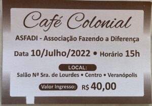 O Café Colonial será realizado neste domingo, dia 10, às 15h, no Salão da Gruta Nossa Senhora de Lourdes. Os ingressos ainda podem ser adquiridos no local e custam R$ 40,00 cada.