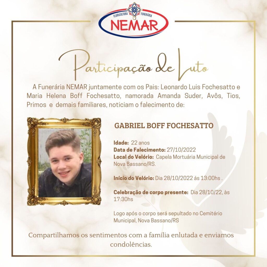 Foi identificado como sendo Gabriel Boff Fochesatto, de 22 anos, natural de Nova Bassano o condutor do automóvel Honda-Civic que se envolveu num gravíssimo acidente na ERS 324. O velório ocorre na Capela Mortuária de Nova Bassano, a partir das 13h desta sexta-feira, dia 28. O sepultamento será no Cemitério Municipal de Nova Bassano, após a celebração de corpo presente, que ocorre às 17h30min. Ele era filho único e deixa pai e mãe. A Comunidade Bassanense está em comoção por mais esta perda. Nesta rodovia, várias pessoas perderam a vida e deixaram famílias destroçadas.