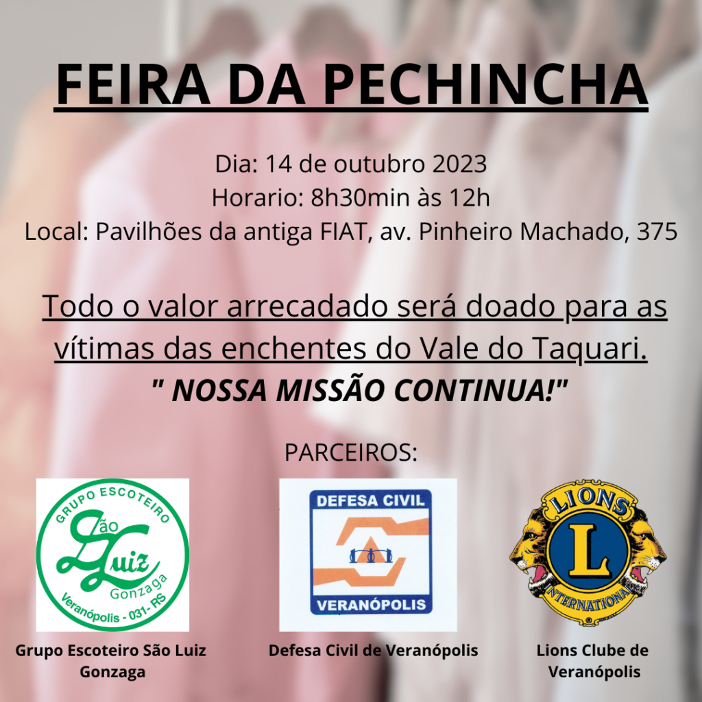 O Lions Club de Veranópolis realizará a tradicional Feira da Pechincha no sábado, dia 14 de outubro, das 8h30min às 12h, nos pavilhões da antiga Fiat. A edição deste ano terá caráter beneficente, sendo realizada em parceria com o Grupo Escoteiro São Luiz Gonzaga e com a Defesa Civil de Veranópolis. Todo o valor arrecadado será revertido para os atingidos pelas enchentes do Vale do Taquari.