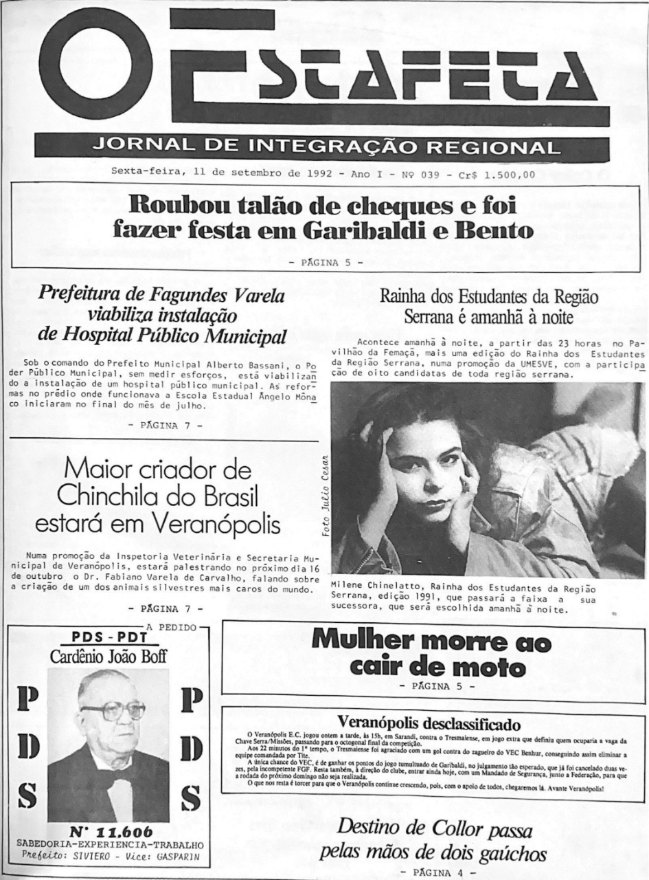 Na edição número 39, d’O Estafeta, que circulou no dia 11 de setembro de 1992, foram os seguintes destaques de capa: Roubou talão de cheques e foi fazer festa em Garibaldi e Bento, Rainha dos Estudantes da Região Serrana é amanhã à noite, Prefeitura de Fagundes Varela viabiliza instalação de Hospital Público Municipal, Maior criador de chinchila do Brasil estará em Veranópolis, Mulher morre ao cair de moto, Veranópolis classificado e Destino de Collor passa pelas mãos de dois gaúchos.