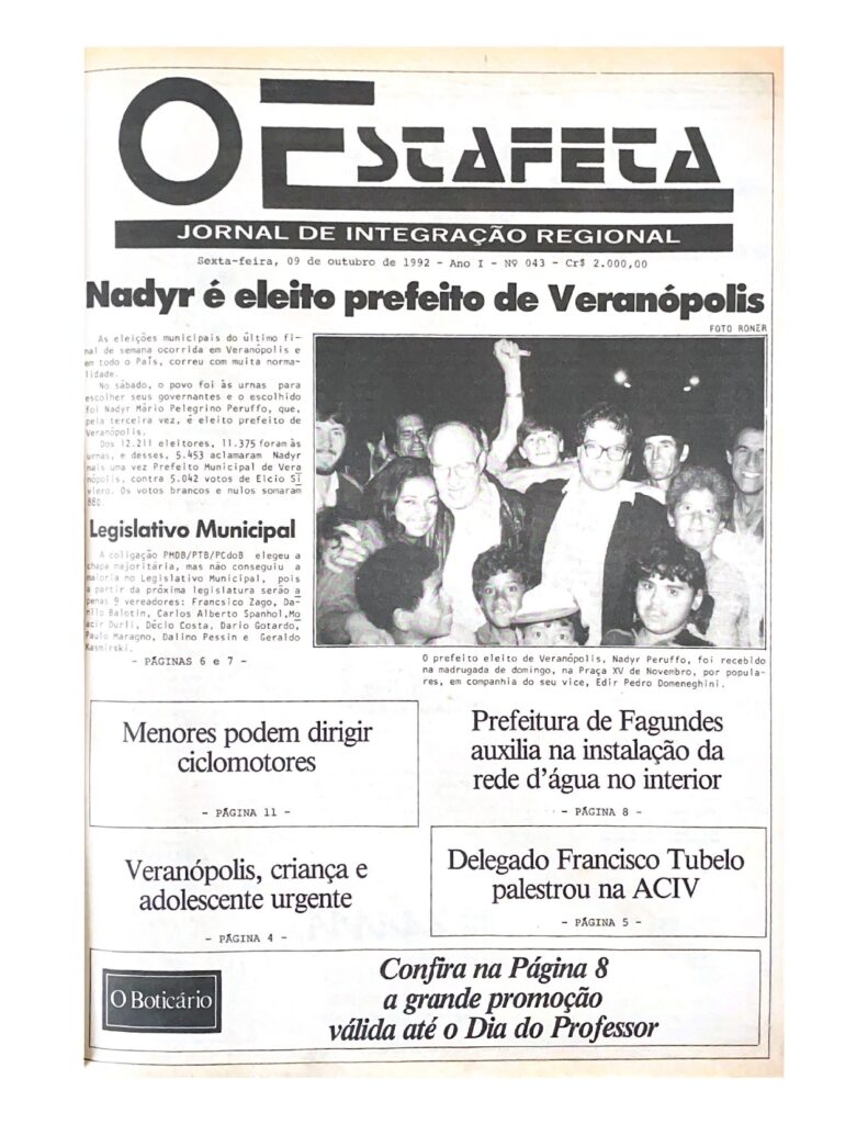 Na edição número 43, d’O Estafeta, que circulou no dia 09 de outubro de 1992, foram os seguintes destaques de capa: Nadyr é eleito prefeito de Veranópolis, Prefeitura de Fagundes auxilia na instalação da rede de água no interior, Menores podem dirigir ciclomotores, Veranópolis criança e adolescente urgente e Delegado Francisco Tubelo palestrou na ACIV.