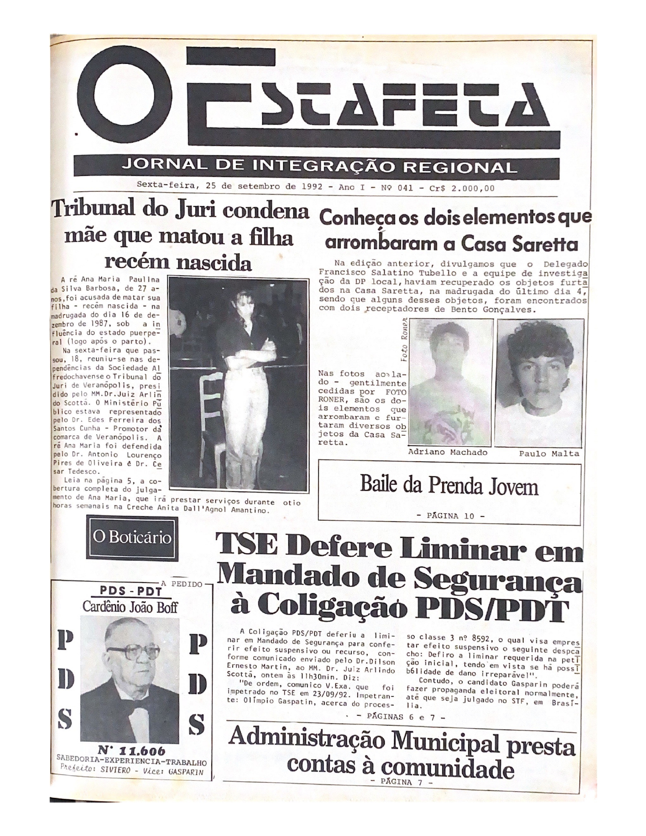 Na edição número 41, d’O Estafeta, que circulou no dia 25 de setembro de 1992, foram os seguintes destaques de capa: Tribunal do Júri condena mãe que matou a filha recém nascida, Conheça os dois elementos que arrombaram a Casa Saretta; Baile da Prenda Jovem, TSE defere liminar em mandado de segurança à coligação PDS/PDT e Administração Municipal presta contas à comunidade.