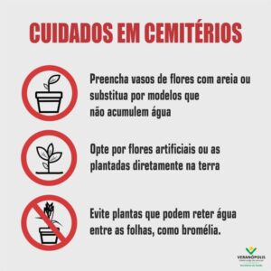 Por isso, quem visita os cemitérios deve tomar alguns cuidados. As chuvas e o aumento das temperaturas transformam qualquer recipiente que acumula água em um local propício para a proliferação do mosquito da dengue. Solicita-se que a comunidade fique em alerta. Não deixe vasos com água dentro das capelas ou água acumulada em nenhum lugar.