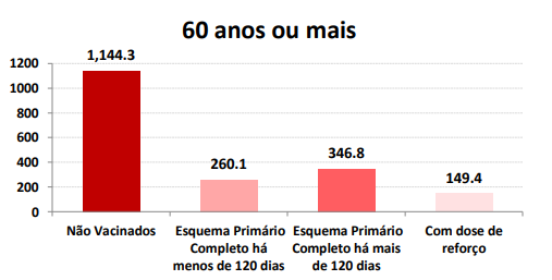 Segundo o estudo do governo, os idosos dessa faixa etária, que apenas completaram o esquema vacinal primário, possuem uma taxa de óbito de apenas 4,4 vezes abaixo dos não vacinados, sendo que quem adquiriu a última dose tem 7,7 chances a mais de não morrer. A aplicação atualizada dos imunizantes aumenta em 3,3 vezes a chance de os idosos sobreviverem ao vírus.