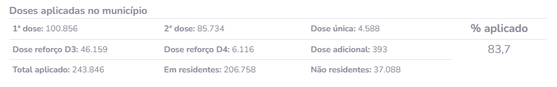 No município de Bento Gonçalves, a taxa de doses aplicadas está em 83,7%, segundo painel da covid-19, pela Secretaria Estadual da Saúde (SES). Portanto, dos 121.803 habitantes vacináveis, 100.856 já receberam, ao menos, a 1ª dose. Já na aplicação seguinte, a 2ª dose, o número reduz para 85.734 vacinados. Para a dose de reforço, as estatísticas de imunizados caem em mais 50%, chegando em 46.159.