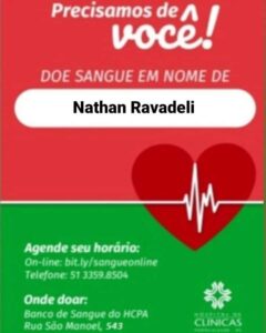 O jovem de Veranópolis Nathan Ravadeli, recebeu na quinta-feira, dia 23, o transplante autólogo de células tronco, ele segue internado no Hospital de Clínicas em Porto Alegre e neste momento ele está necessitando urgentemente de doação de sangue.