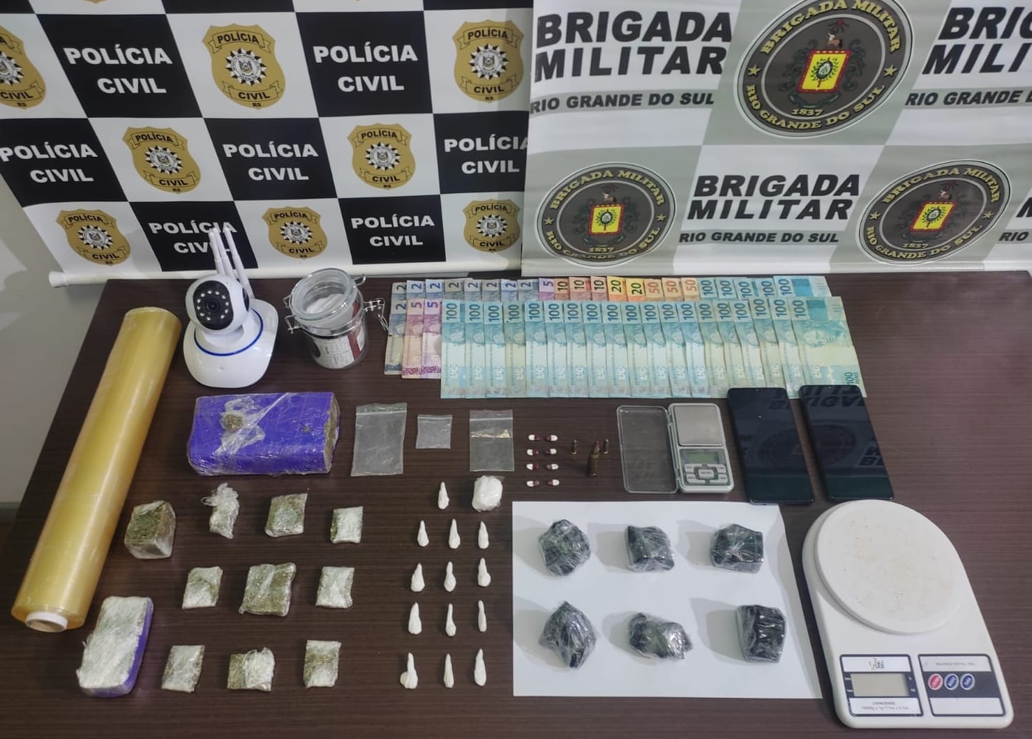 O fato ocorreu em um bar, localizado na área central do município, sendo preso o casal, um homem de 24 anos, e uma mulher de 22. Com eles foi apreendido um tijolo de maconha (545g), 11 porções de maconha fracionadas prontas para venda (235g), sete porções de cocaína (300g), 13 buchas de cocaína embaladas prontas para venda (6g), oito comprimidos de droga sintética, duas balanças de precisão, dois aparelhos celulares, R$ 2.653 em dinheiro, material para fracionar e embalar a droga, uma câmera de monitoramento, duas munições intactas calibre .22 e uma munição calibre 762.