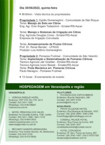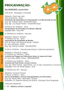 A programação do dia 29 de junho, acontece no Salão da Gruta N.S. de Lourdes, e contará com palestras que irão abordar diversos assuntos que envolvem o cultivo de citrus, como cuidados com as mudas, controle de pragas e doenças, uso de fitorreguladores, entre outros.