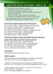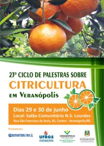 Se o cultivo de citrus (laranja, bergamota, limão, lima, tangerina) lhe interessa, programe-se para participar do 23º Ciclo de Palestras sobre Citricultura que acontecerá em Veranópolis nos dias 29 e 30 de junho.